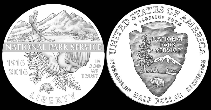 The clad half-dollar obverse features a hiker discovering the majesty of the wilderness and a small child discovering a frog hiding in ferns, which celebrates the diversity and breadth of the NPS. Inscriptions are LIBERTY, 2016, IN GOD WE TRUST, 1916, and NATIONAL PARK SERVICE. The obverse was designed by AIP artist Barbara Fox and will be sculpted by United States Mint Sculptor-Engraver Michael Gaudioso.