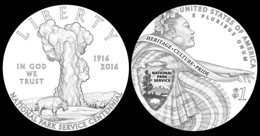 The silver dollar obverse features Yellowstone National Park’s Old Faithful geyser and a bison, with the inscriptions LIBERTY, NATIONAL PARK SERVICE CENTENNIAL, IN GOD WE TRUST, and 1916-2016. United States Mint Sculptor-Engraver Joseph Menna designed and sculpted it.