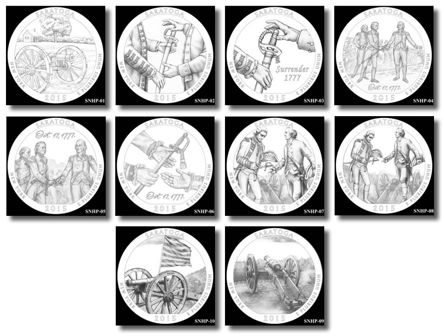 Before the image for the Saratoga quarter was selected, ten candidate designs went under review. All of them offered scenes emblematic of the site during the American Revolutionary War.