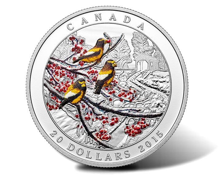 Limited to 8,000 with 77% already sold, the Mint’s 2015 Weather Phenomenon: Winter Freeze Silver Coin features a classic Canadian winter scene with three evening grosbeaks enhanced with selective coloring.