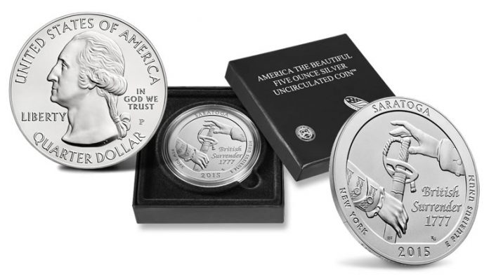 The U.S. Mint in Philadelphia also produces five ounce bullion versions intended for investors. 2015 Saratoga Five Ounce Silver Bullion Coins went on sale Monday, Nov. 30, and 35,800 were claimed by the end of the day. Sales climbed another 9,200 on Tuesday, Dec. 1, and the Mint declared their sellout.