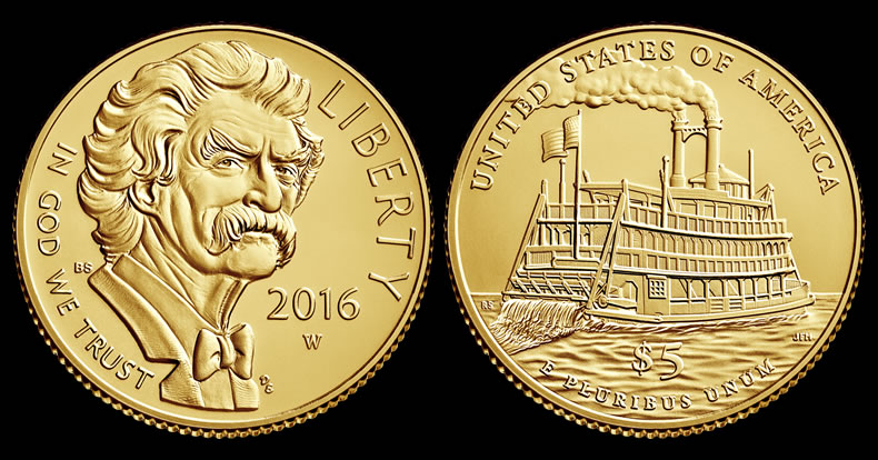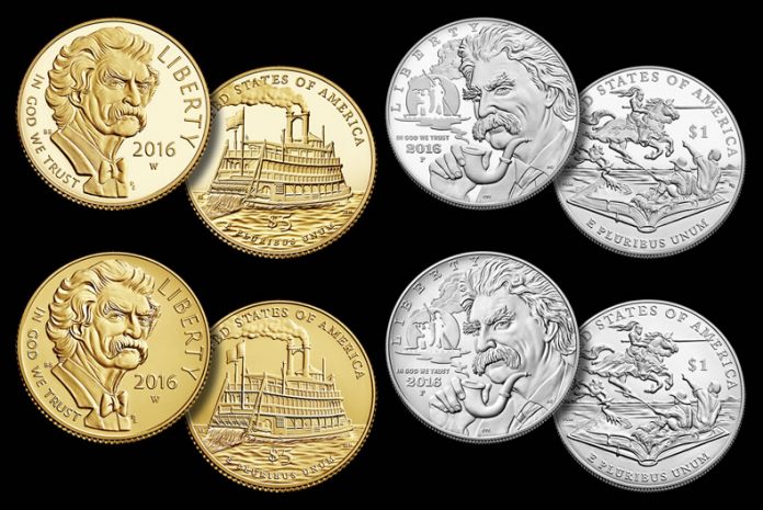 Featuring portraits of the famed author and scenes from his books, the 2016 Mark Twain Commemorative Coins will launch in collector finishes of proof and uncirculated and in quantities of up to 100,000 $5 gold coins and 350,000 silver dollars.