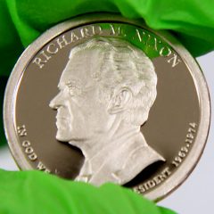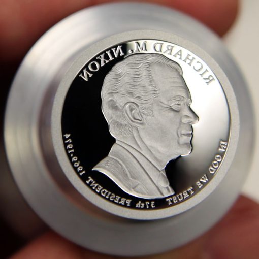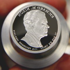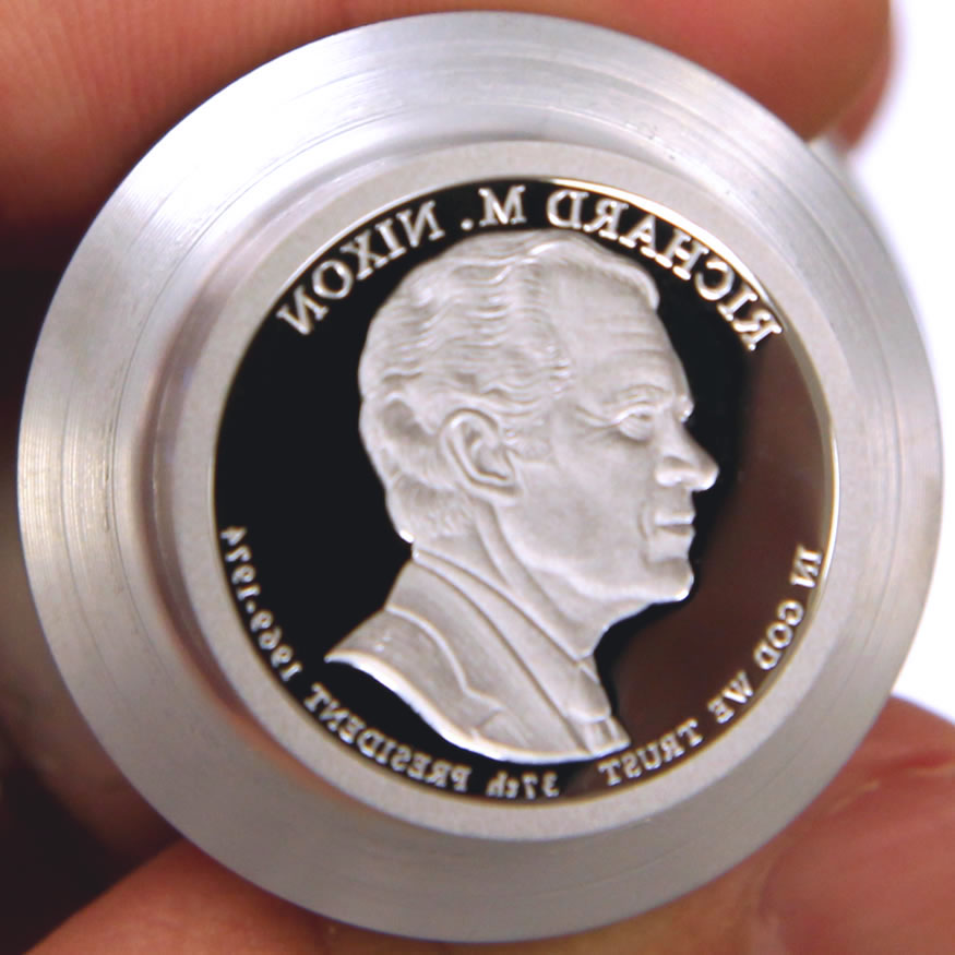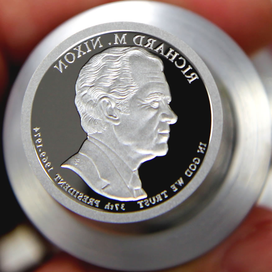 We recently stopped by the U.S. Mint’s facility in San Francisco where proof versions of coins are made for collectors. These editions showcase frosted designs and mirror-like backgrounds. We were fortunate in getting to see and photograph proof Nixon dollars and the dies used to strike them. Here are some photos of the proof dollar:
