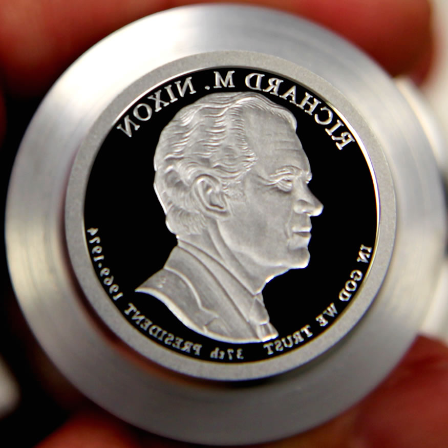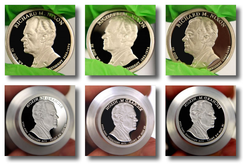 To strike the coins, the U.S. Mint uses hardened dies. These dies are produced at the Philadelphia Mint and finished by talented artists at the San Francisco Mint, giving them the attributes to create the collector grade coins produced there. (See how the SF Mint prepares dies.) A couple photos of Nixon dies appear below.