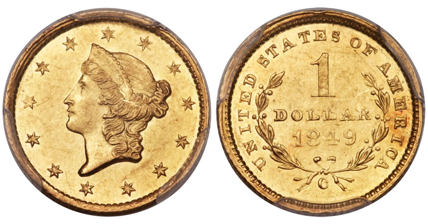 Topping the gold offerings are an 1849-C G$1 Open Wreath MS62 PCGS Secure, the finest-known specimen and one of the rarest and most valuable coins in the U.S. gold series, along with an 1804 Quarter Eagle, 13 Stars Reverse, AU55 PCGS Secure CAC, the second finest known example of the exceedingly rare BD-1 Variety.