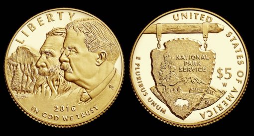 Both $5 gold coins are made at the West Point Mint and carry the ‘W’ mint mark. Below are images of the proof and uncirculated editions. Their obverse (heads side) features John Muir and Theodore Roosevelt with Yosemite National Park’s Half Dome in the background.