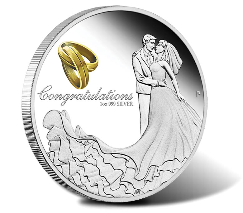 This wedding-themed silver coin is presented as a gift idea for those just married. A design of a bride and groom appear on the reverse beside two intertwined gold wedding rings. Completing the design are inscriptions of Congratulations and 1 oz 999 SILVER.