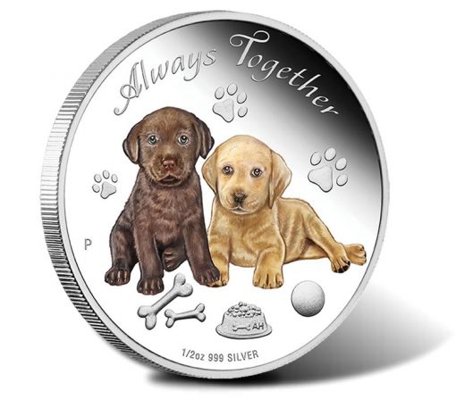 Friendship is front and center on this special 1/2 oz coin in 99.9% pure silver. The design features a chocolate Labrador beside a yellow Labrador with paw prints above and two bones, a bowl of food, and a ball below. Always Together is inscribed above.