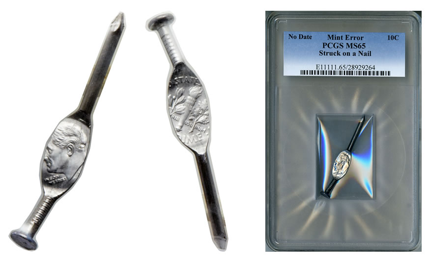 What is known is that the zinc-coated nail found its way into the coinage production line during the minting of Roosevelt dimes and apparently escaped through normal distribution channels.
