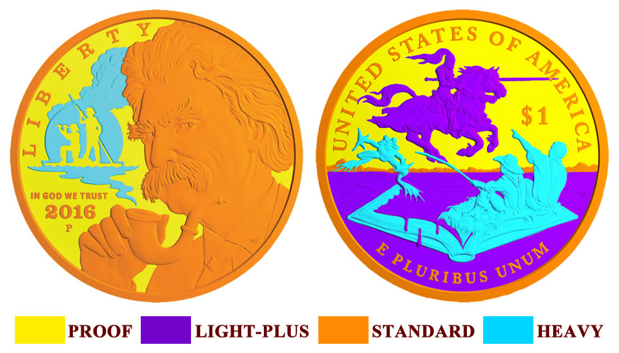 As shown above, the yellow is mirror-like proof polish, purple is light-plus laser frosting, orange is standard laser frosting and blue is heavy laser frosting. The $5 Mark Twain Gold Proof Coin has similar treatments.