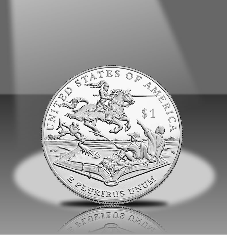 The reverse depicts characters from Twain’s works leaping from the pages of a book. Inscriptions include UNITED STATES OF AMERICA, $1 and E PLURIBUS UNUM. AIP artist Patricia-Lucas Morris designed the reverse image with engraving by Mint Sculptor-Engraver Renata Gordon.