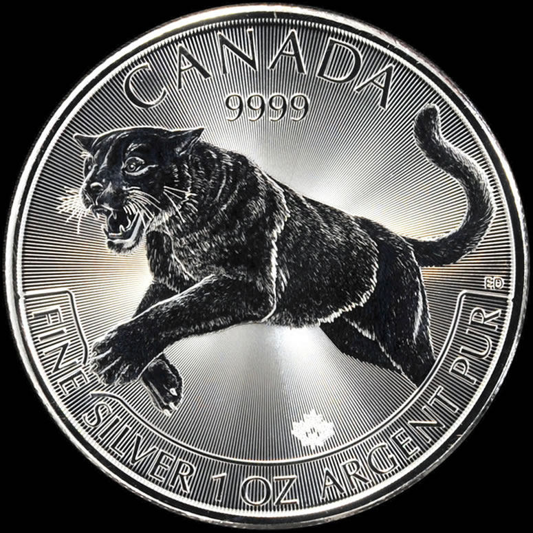 Designed by Canadian artist Emily Damstra, a leaping cougar is shown against a background of precise radial lines. Inscriptions include CANADA, 9999, FINE SILVER, 1 OZ, ARGENT PUR and ED for the artist’s initials.