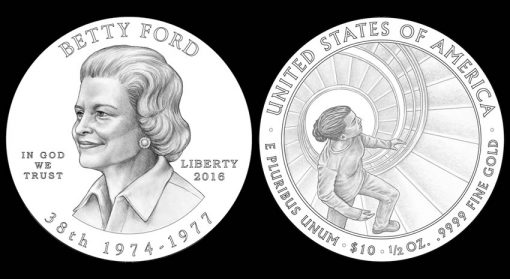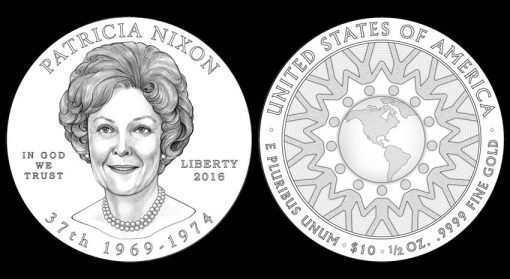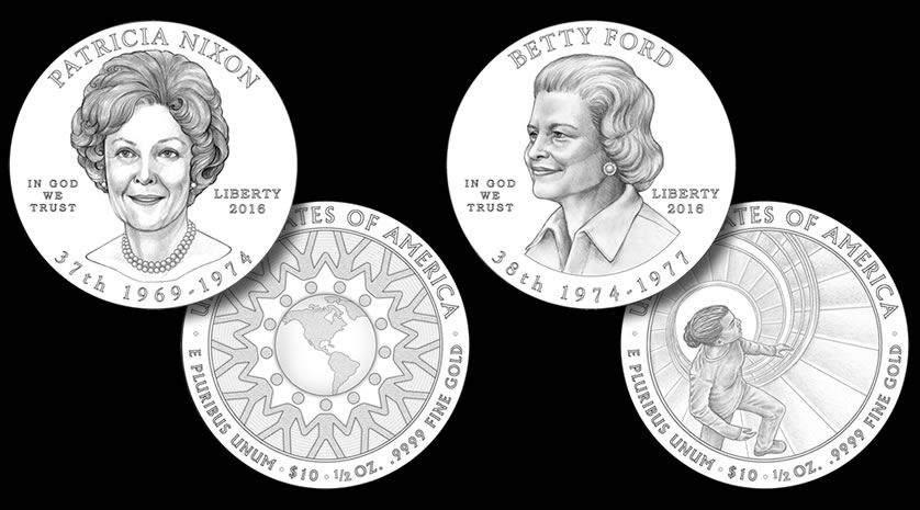 During an event on Saturday celebrating the 105th anniversary of Ronald Reagan’s birth, the United States Mint unveiled designs for the gold coin commemorating Nancy Reagan. On Monday, the agency announced designs for the other 2016 spousal coins honoring Patricia Nixon and Betty Ford.