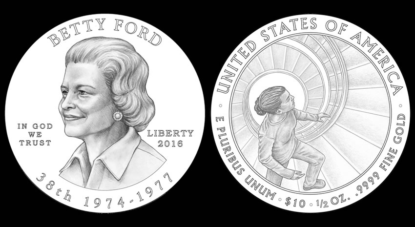 Barbara Fox designed and Michael Gaudioso sculpted the obverse of the Betty Ford First Spouse Gold Coin.