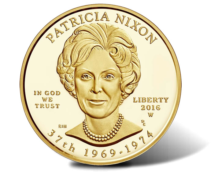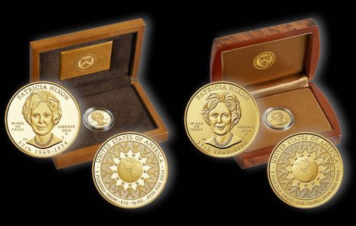 Featuring designs emblematic of Patricia Nixon, wife of the 37th U.S. President Richard Nixon, they are composed of one-half ounce of 24-karat gold and appear in both proof and uncirculated collector-grade finishes.