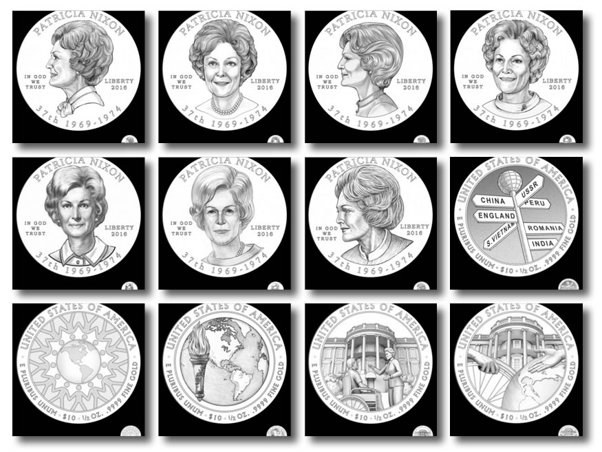 Design candidates for the Patricia Nixon coin became public in October 2014. They included a total of seven obverse portraits of Mrs. Nixon and five reverse designs emblematic of her life. Earlier this month, the U.S. Mint announced the final designs.