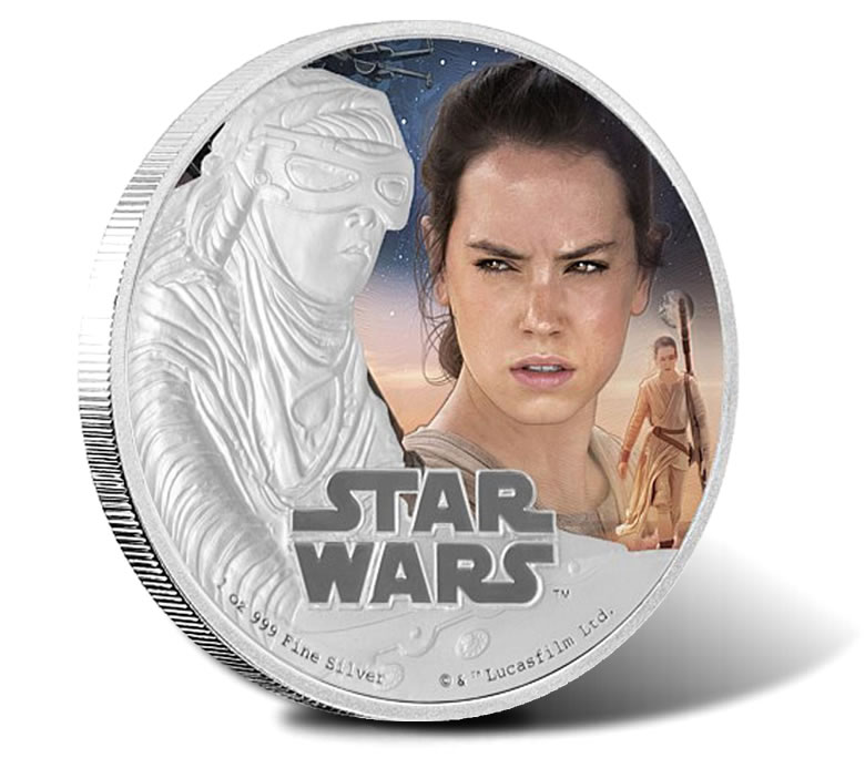 Celebrating the recent movie mega-blockbuster Star Wars: The Force Awakens, the Perth Mint of Australia is selling a new silver coin portraying one of its main characters. Now available is the Star Wars: The Force Awakens – Rey 1 oz Silver Coin.