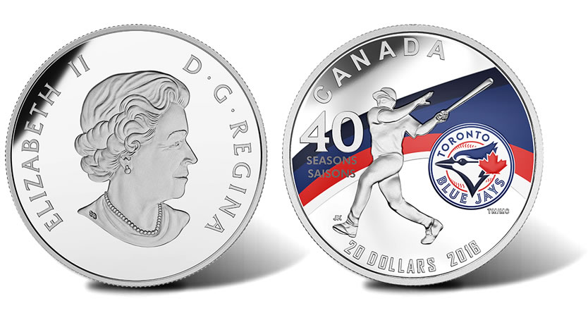 Designed by Canadian artist Joel Kimmel, the proof coin features a red and white wave inspired by the team’s colors. It flows behind the silhouette of a player with the tell-tale stance of a homerun hitter. A large engraved "40" commemorates four decades of play since Toronto was granted its MLB franchise in 1976. The figure of the player is also flanked by the team’s official logo.