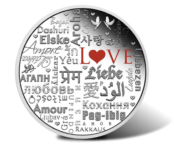 Designed by Natasha Muhl, the emotional word ‘love’ is translated into many different languages and displayed on the 2016 $2 Language of Love 2 oz Silver Proof Coin. The English translation of the word appears in red and includes a heart image for the letter ‘o’. In addition to the language translations, lips, two doves and a cupid can be seen.