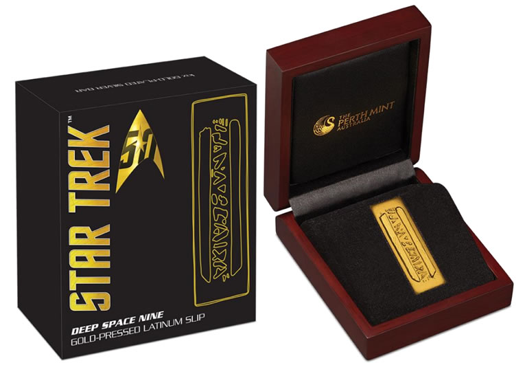 Continuing the Perth Mint’s Star Trek related products, this officially licensed collectible is struck from one ounce of 99.9% pure silver with gold plating to resemble a slip of gold-pressed latinum as seen in Star Trek: Deep Space Nine.