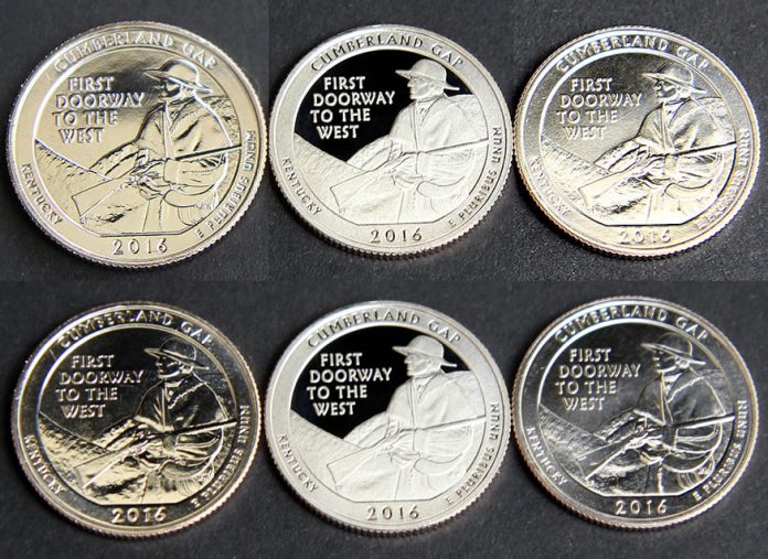 Today, May 2, the United States Mint launched its three-coin set of 2016 Cumberland Gap quarters for $9.95. Coins in the set commemorate the national historical park in Kentucky and feature a design on the reverse side that is emblematic of it.