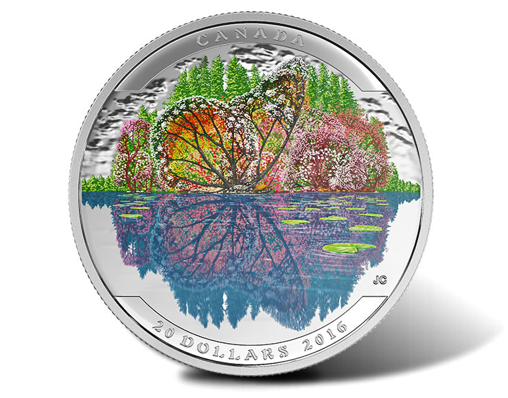 Canadian artist Julius T. Csotonyi designed the scene. Reverse inscriptions include CANADA, the coin’s legal tender face values of 20 DOLLARS, the year 2016, and the artist’s initials, JC.