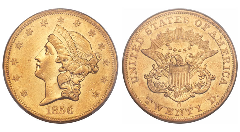 A key date 1856-O Liberty double eagle, graded AU55 by PCGS, is another major rarity that is expected to fall under the auction hammer with a high bid. Not many were made. Its lot description notes that the recorded mintage of 2,250 pieces is the smallest production total of the series and virtually all of them were placed into circulation.