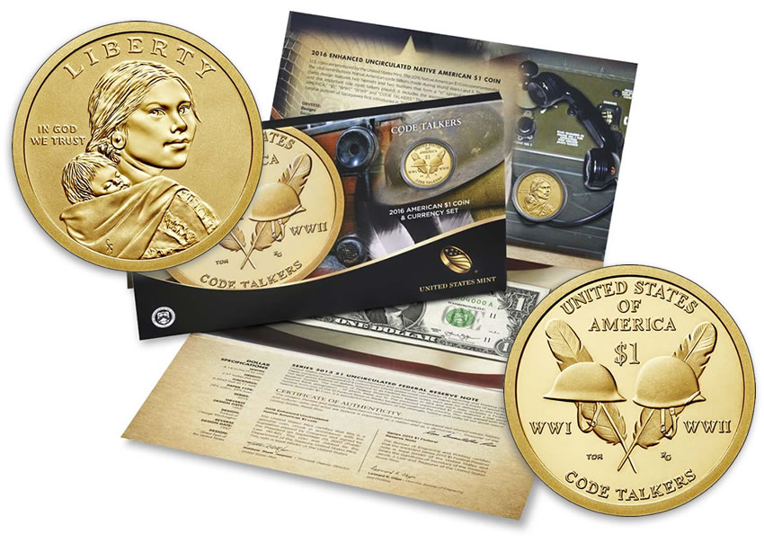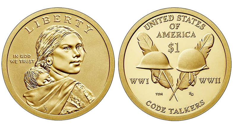 Reverse designs on Native American $1 Coins change annually. This year’s dollar design honors American Indians who used their native language to send coded messages in World War I and II. It is the eighth unique reverse in the series, which honors the important contributions made by Native American tribes and individual Native Americans to the development and history of the United States.