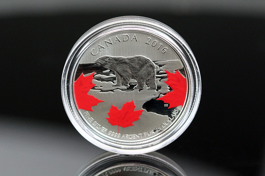 Designed by Canadian artist Trevor Tennant, the latest $25 for $25 series coin captures the majestic polar bear and the noble maple leaf. Around the polar scene are inscriptions of CANADA 2016, FINE SILVER 9999 ARGENT PUR and 25 DOLLARS.