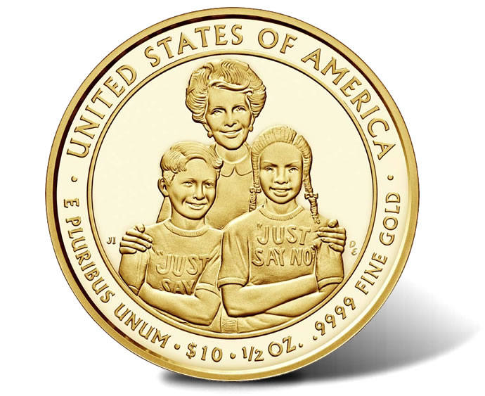 Featuring a portrait and design emblematic of Mrs. Reagan, the wife of Ronald Reagan who was the 40th President of the United States, the gold pieces are produced in one-half ounce of 24-karat gold to a purity of .9999 fine.