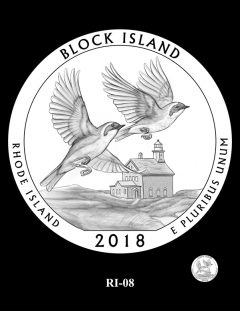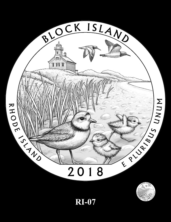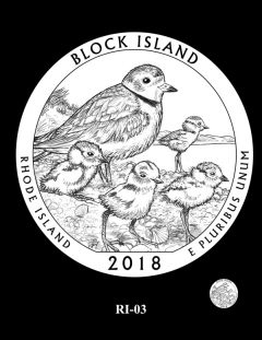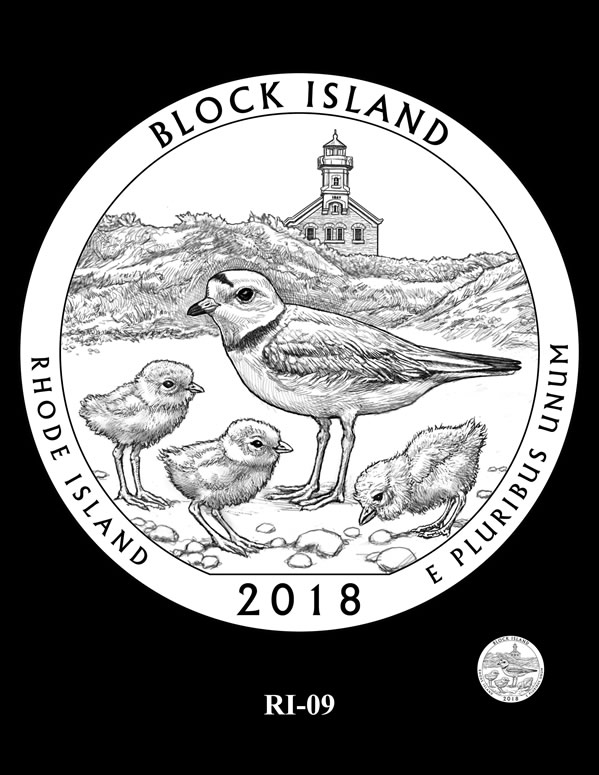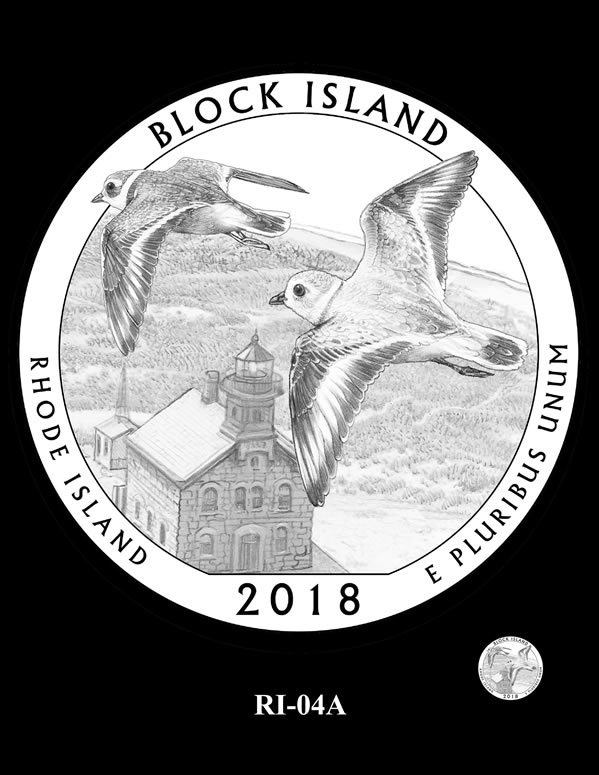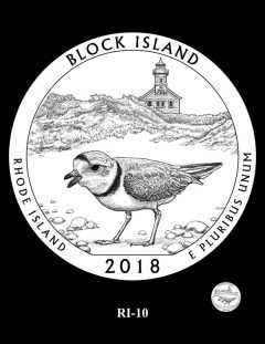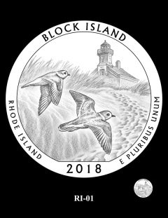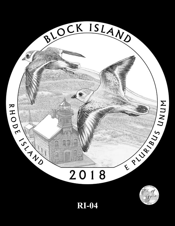 RI-04, RI-04A, and RI-05 feature two piping plovers flying over the North Light lighthouse.