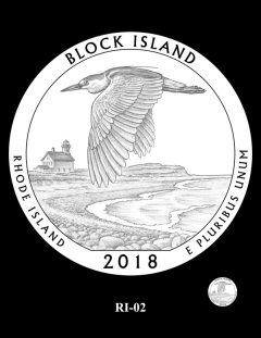 RI-02 depicts a black-crowned night-heron flying over a view from the beach at Cow Cove looking towards Sandy Point. The North Light lighthouse is seen in the background. This design was preferred by the CFA and refuge officials.