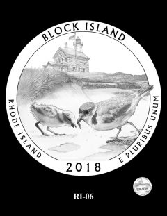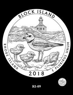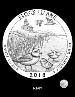 RI-06 and RI-07 feature a mother piping plover with her young on the shore in front of North Light. In design 07, two American oystercatchers fly overhead.