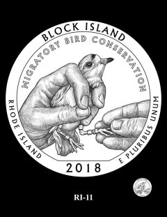 RI-11 depicts a piping plover being banded as part of conservation efforts to study migratory bird patterns.