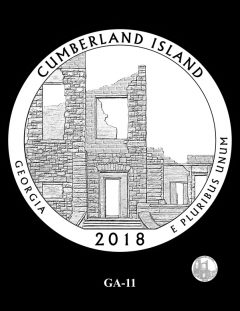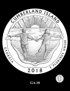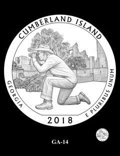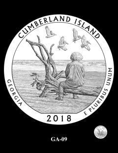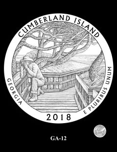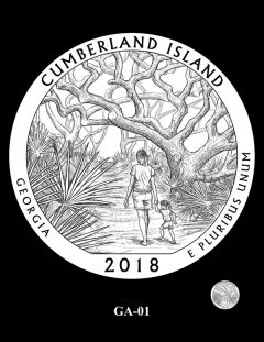 GA-01 features an adult and young child walking through the Live Oak trees of Cumberland Island. Site officials preferred this design.
