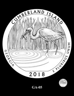 GA-05 depicts a blue heron capturing a fish in the marsh waters along the western edge of the island.