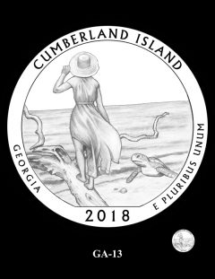 GA-03 depicts a loggerhead sea turtle swimming along the undeveloped beach of Cumberland Island. The CCAC selected this design.