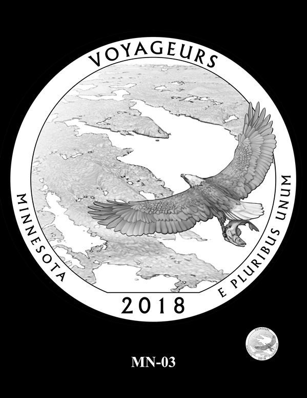 MN-03 features an eagle soaring above the interlocking network of lakes in Voyageurs National Park. In its talons, it clutches a walleye, the state fish of Minnesota.