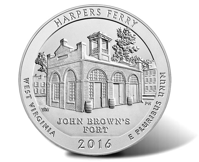 Harpers Ferry National Historical Park of West Virginia is the newest national site honored on a large format silver coin now available from the United States Mint. Struck from five ounces of .999 fine silver with a diameter of three inches, the collectible is the third 2016-dated release from the U.S. Mint’s program of America the Beautiful Five Ounce Silver Uncirculated Coins.