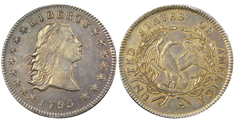 Struck at the U.S. Mint in Philadelphia, this dual-plugged 1795 Flowing Hair silver dollar weighs 26.98 grams.