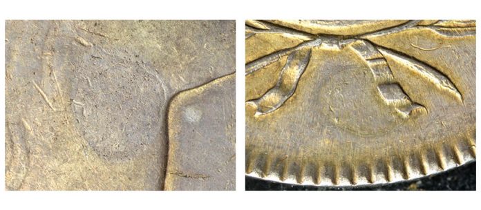 Authenticated by Numismatic Guaranty Corporation (NGC) and graded AU53, this first-of-its-kind rarity has two distinct silver plugs each measuring about 4 millimeters in diameter. Other silver dollars of the year feature plugs, but this is the first known example to have two of them.