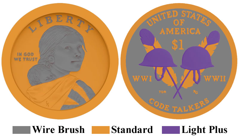 In the die production stage, the fields and artwork are wire brushed. This step results in a base finish that is bright but without all the polished characteristics of a proof coin. A laser then passes over preprogrammed design elements and at different intensities to create two contrasting frost levels. The color key in the graphic above and listed below describes the three treatments:
