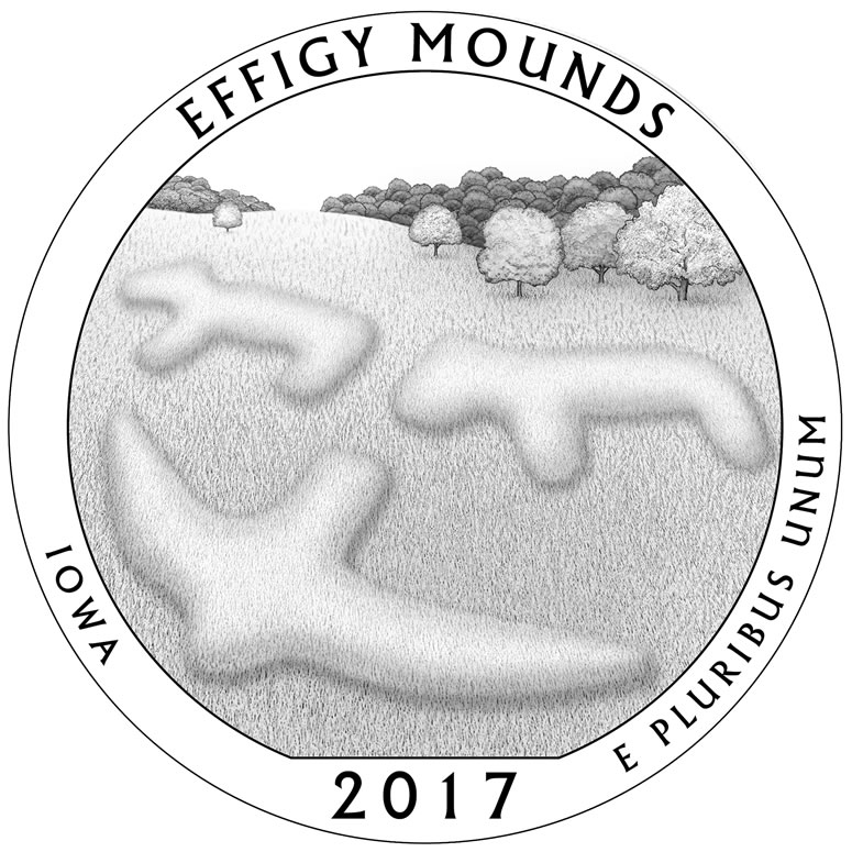 The design depicts an aerial view of mounds in the Marching Bear Group. Inscriptions are "EFFIGY MOUNDS," "IOWA," "2017," and "E PLURIBUS UNUM."