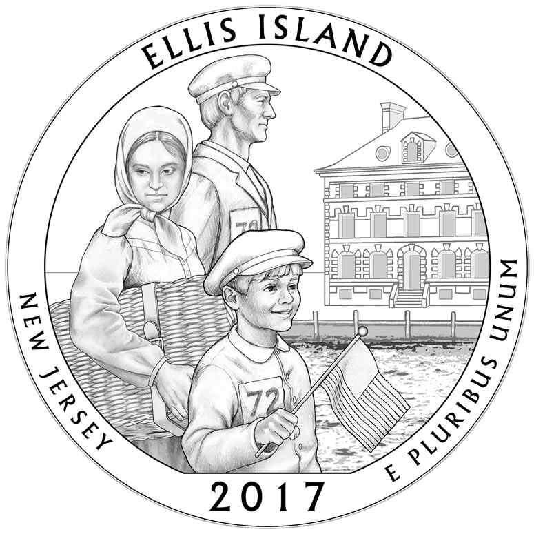 The design depicts an immigrant family approaching Ellis Island with a mixture of hope and uncertainty. The hospital building can be seen in the background. Inscriptions are "ELLIS ISLAND," "NEW JERSEY," "2017," and "E PLURIBUS UNUM."