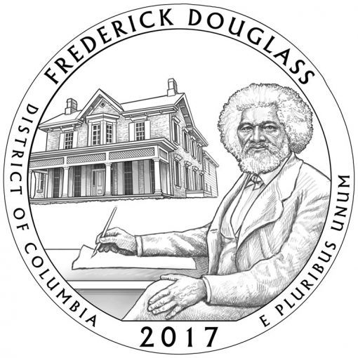 The design depicts Frederick Douglass seated at a writing desk with his home in Washington, D.C., in the background. Inscriptions are "FREDERICK DOUGLASS," "DISTRICT OF COLUMBIA," "2017" and "E PLURIBUS UNUM."