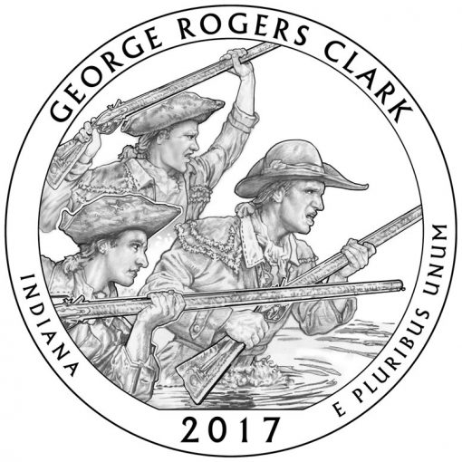 The design features George Rogers Clark leading his men through the flooded plains approaching Fort Sackville. Inscriptions are "GEORGE ROGERS CLARK," "INDIANA," "2017" and "E PLURIBUS UNUM."