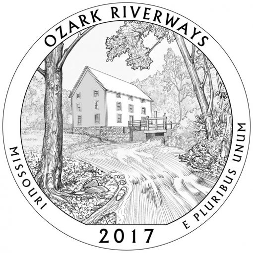 The design depicts Alley Mill, a steel roller mill built in 1894. This merchant mill was used to convert wheat into flour. Much of the original milling equipment is still in place, and visitors to the park can tour the mill. Inscriptions are "OZARK RIVERWAYS," "MISSOURI," "2017" and "E PLURIBUS UNUM."