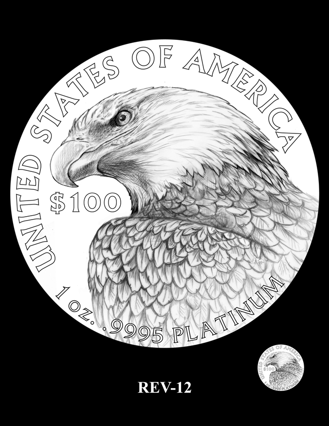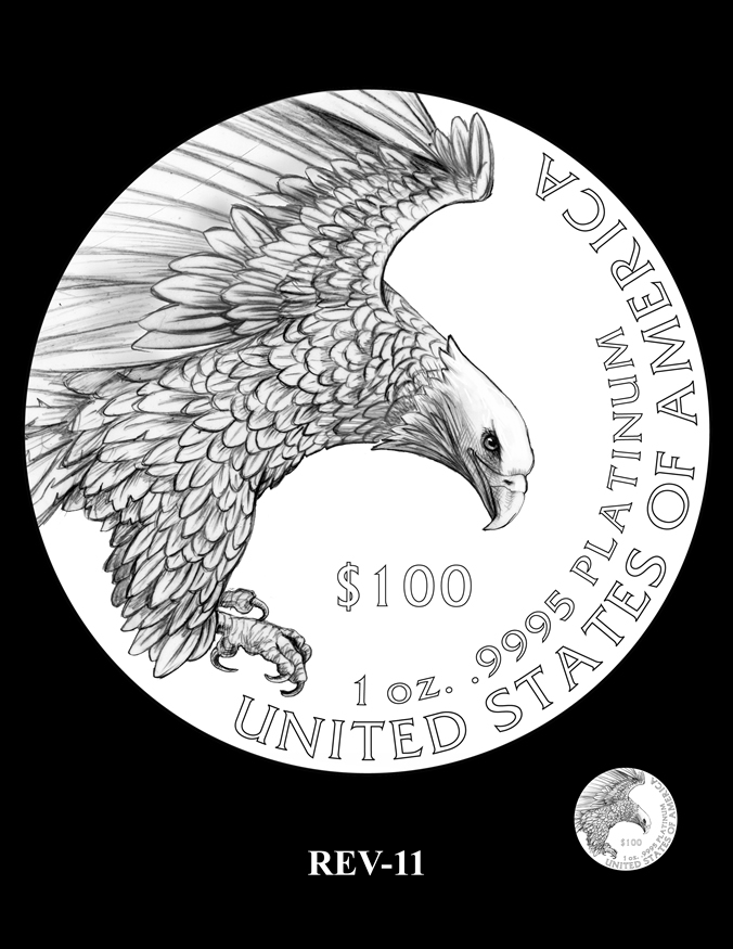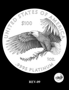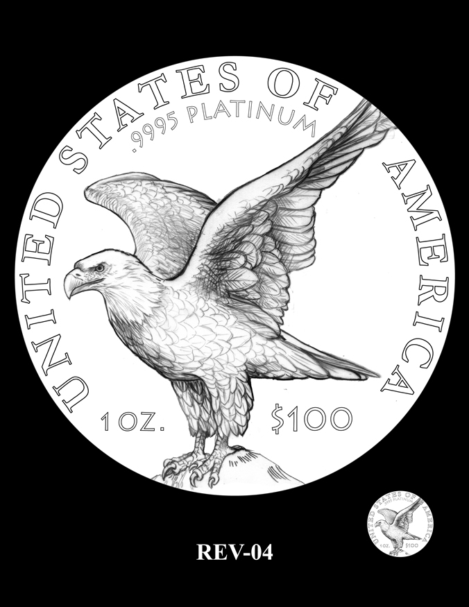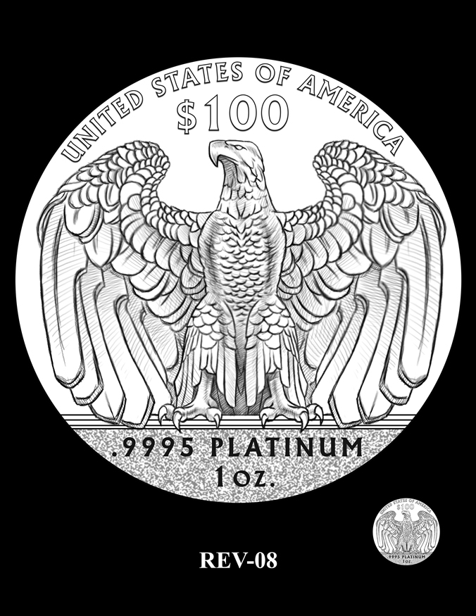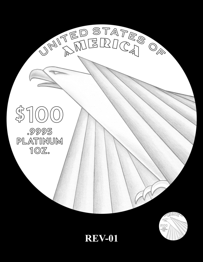 Their reverses will have a common design depicting an American eagle with surrounding inscriptions of "United States of America," "1 oz.," ".9995 Platinum," and the denomination, "$100."