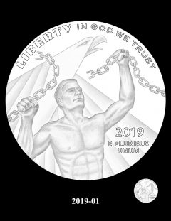 2019-01 expresses the core principle of "Liberty" by depicting a man breaking through chains as an American eagle works to preserve and ensure his freedom.
