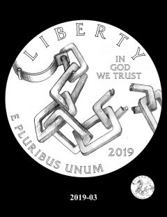 2019-03 conveys "Liberty" through broken shackles and chains, a representation of the right of self-determination. The design draws its inspiration from the actual sculpted broken chains that lay at the Statue of Liberty’s feet, part of its commemoration of the perseverance of freedom and democracy in the United States.